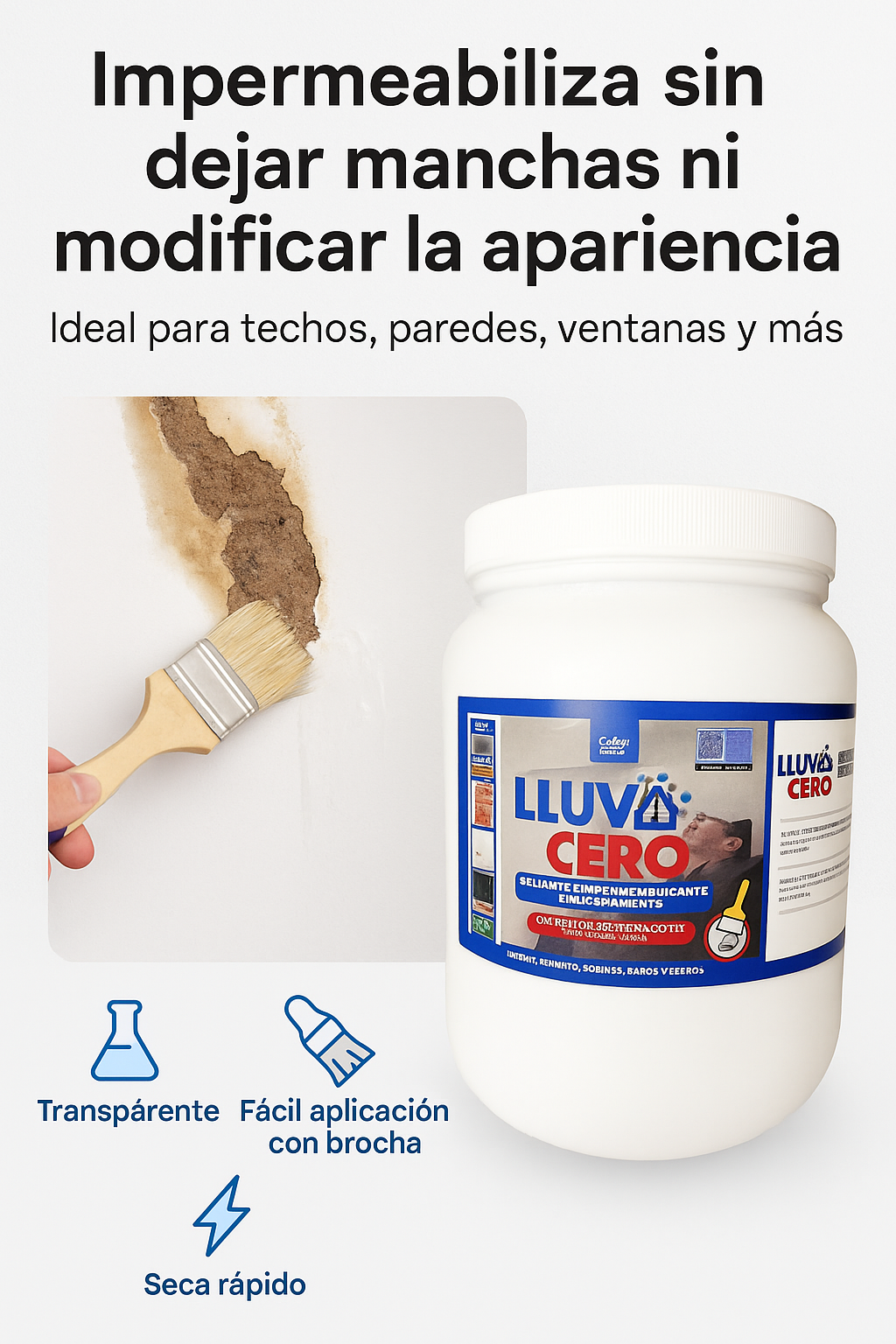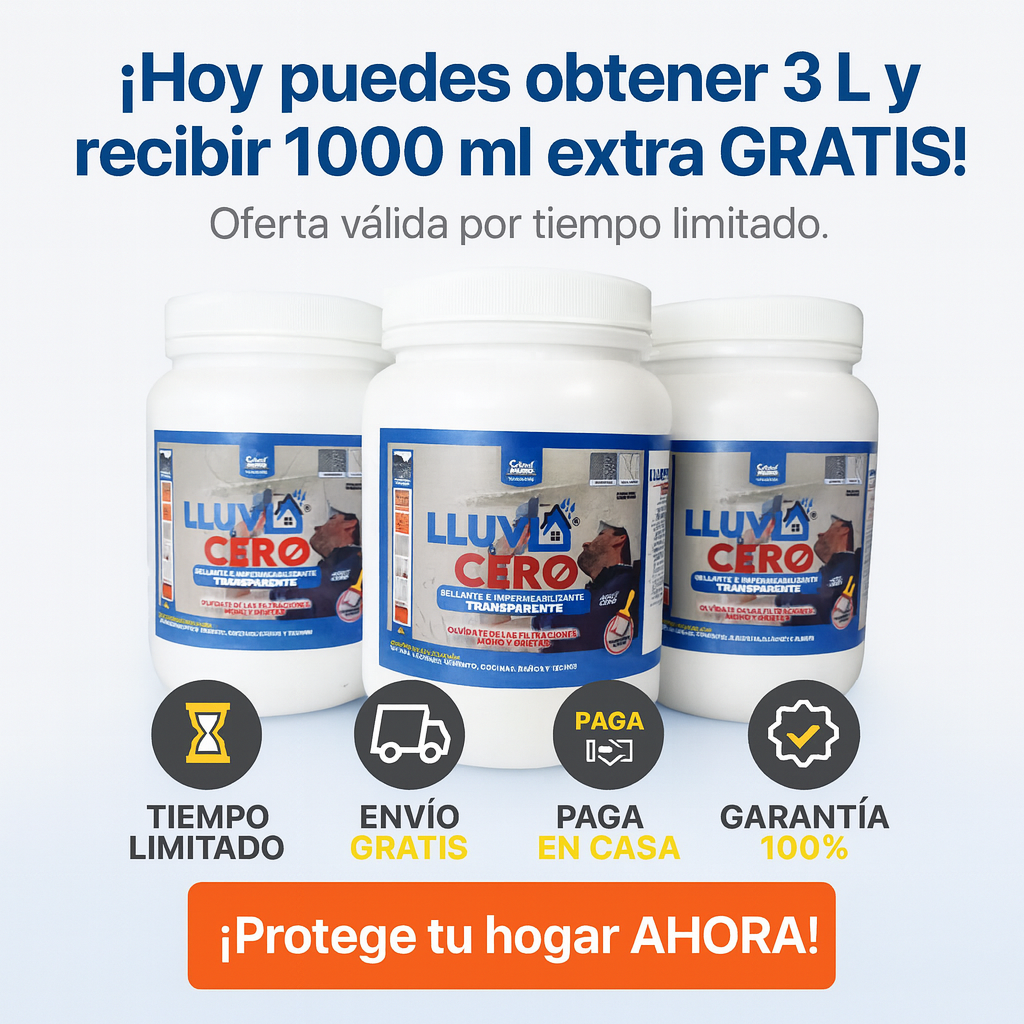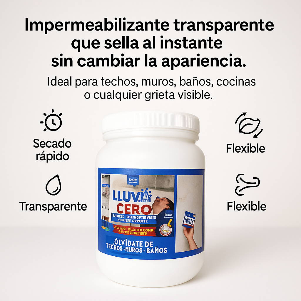 Lluvia Cero™ crea una capa transparente de alta adherencia y elasticidad que sella grietas y repele el agua al instante, sin cambiar la apariencia de tus superficies.