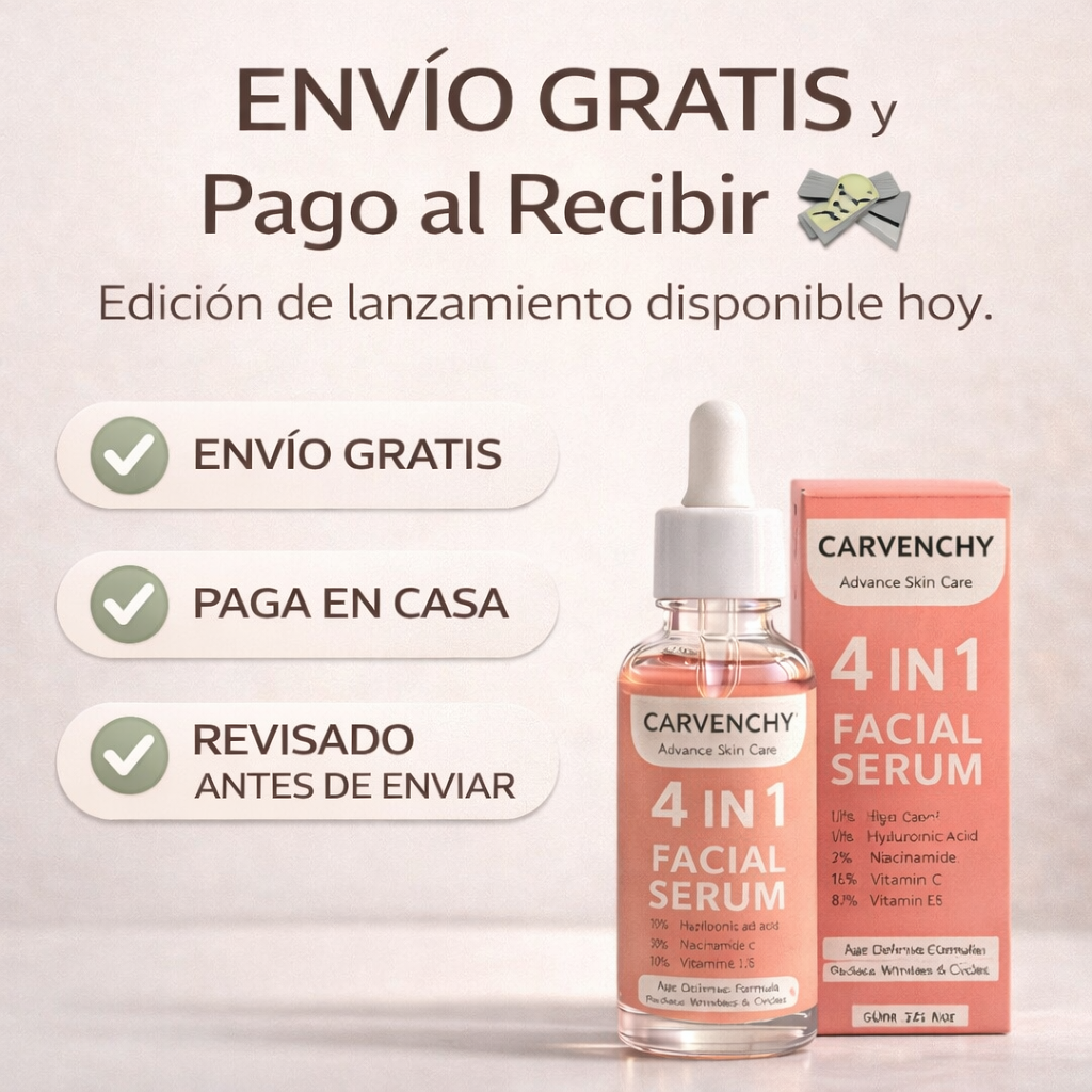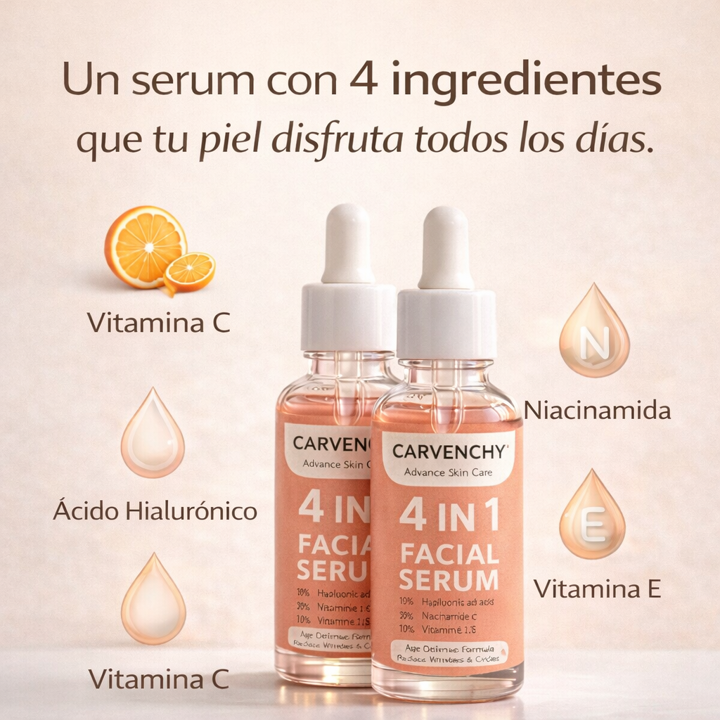 Este Serum 4 en 1 combina ingredientes cosméticos reconocidos por su capacidad de mejorar la apariencia general del rostro: